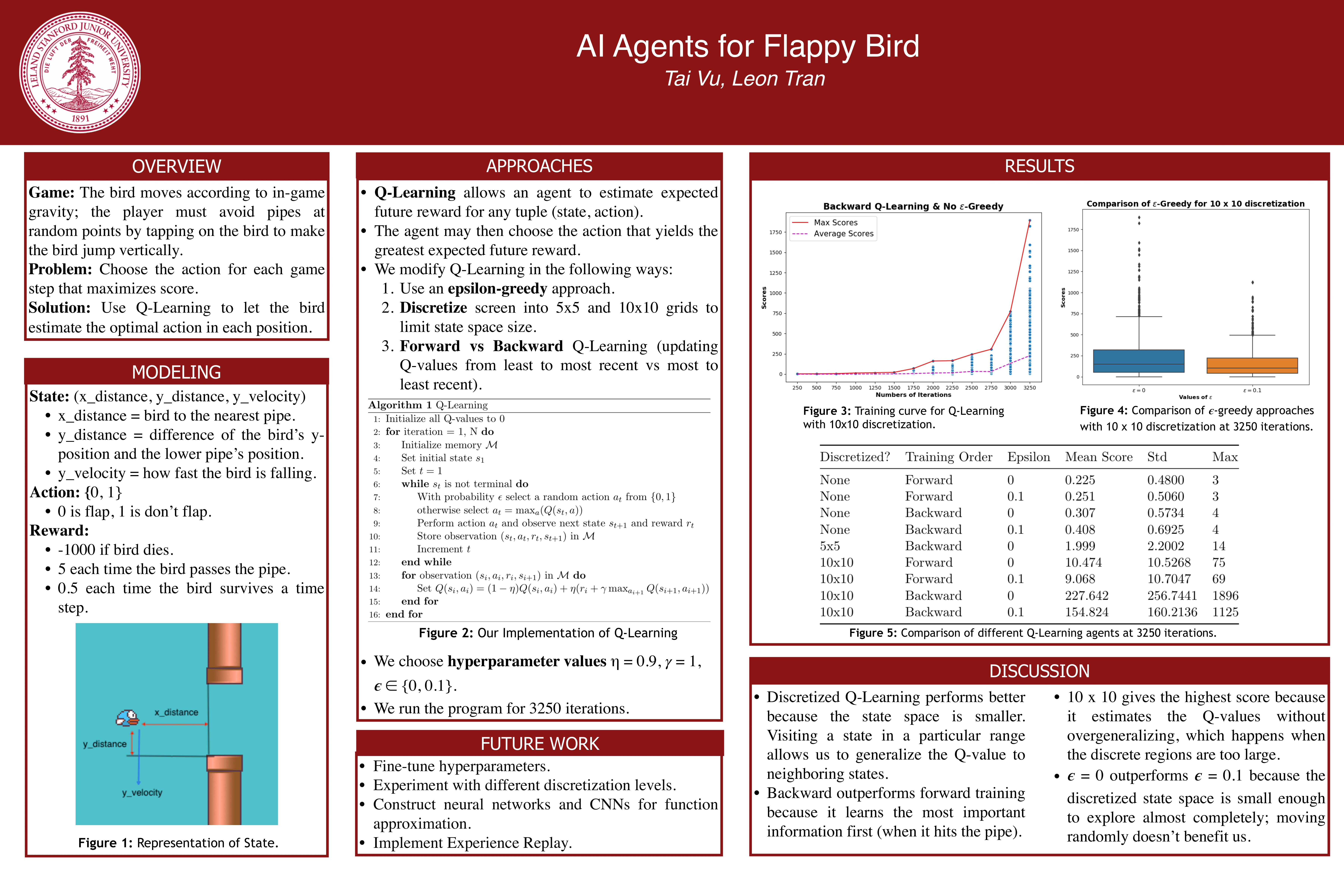 Key findings: (1) Backward trajectory processing provides the single largest performance boost by efficiently propagating the −1000 death signal. (2) Off-policy Q-Learning outperforms on-policy SARSA — learning the optimal policy regardless of exploration noise. (3) State discretization critically impacts tabular methods — the rounding parameter controls a bias-variance trade-off. (4) CNN agents learn directly from pixels but require higher sample complexity, demonstrating the cost of learning visual features from scratch vs. hand-crafted state representations.