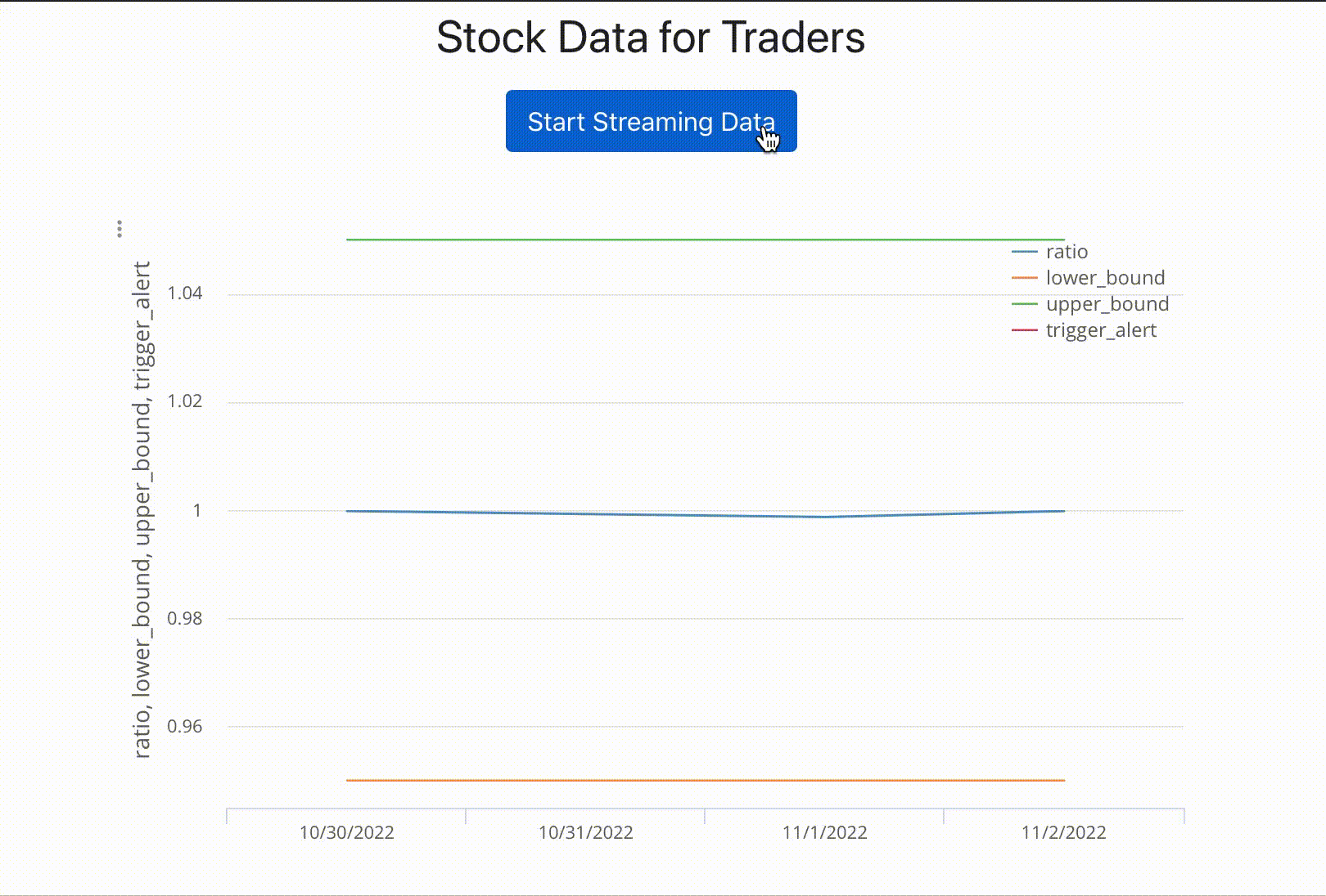 The mid-price (midpoint of best bid and best ask) filters out spread noise, providing a fairer estimate of the “true” price. The price ratio (ABC/DEF) is the fundamental pairs trading signal — when historically correlated stocks diverge beyond the ±5% bands, a mean-reversion trade is signaled. The trigger alert fires by plotting the ratio only when it breaches a bound; undefined values leave gaps in the line, visually highlighting anomalous crossings.